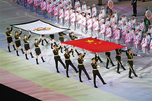 “五星红旗迎风飘扬,胜利歌声多么响亮……”伴随着《歌唱祖国》的嘹亮歌声,16名仪仗兵迈着有力的步伐,分别护拥着中华人民共和国国旗、国际军事体育理事会会旗走进现场。经过主席台时,仪仗兵高举旗帜,正步前行。在雄壮的中华人民共和国国歌声中,鲜艳的五星红旗冉冉升起。随后,奏国际军事体育理事会会歌,升国际军事体育理事会会旗。